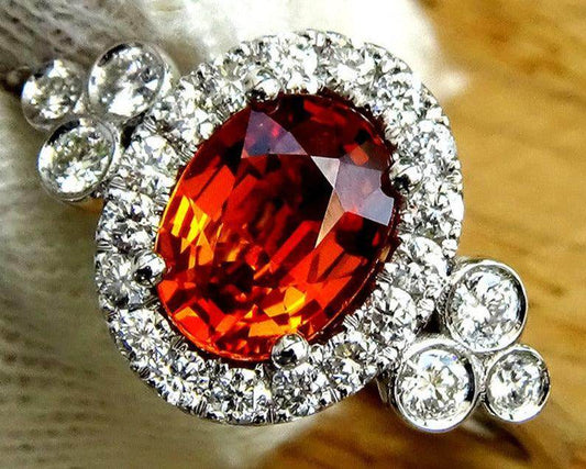 The center boasts a stunning blue sapphire. This is a crowning glory of scintillating sapphires—orange, red, and yellow-suffused brilliance. Surrounded by a halo of twinkling natural diamonds and crafted from premium 14k and 18k yellow gold, this ring is bound to steal your heart.
