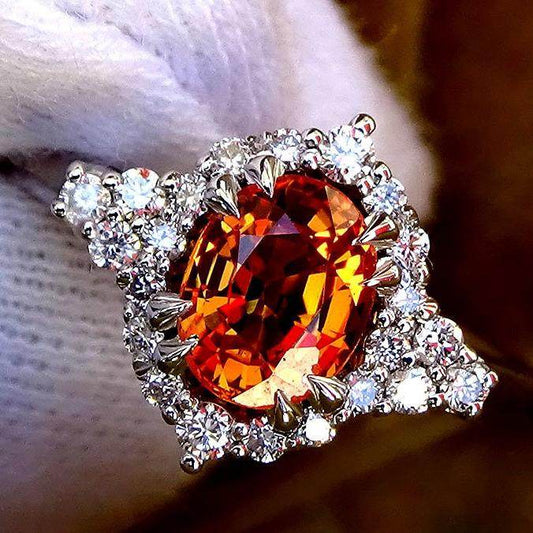The center boasts a stunning blue sapphire. This is a crowning glory of scintillating sapphires—orange, red, and yellow-suffused brilliance. Surrounded by a halo of twinkling natural diamonds and crafted from premium 14k and 18k yellow gold, this ring is bound to steal your heart.