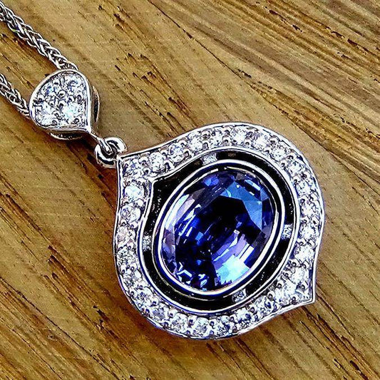 Surrounded by a riotous halo of natural diamonds, each cut and color serves to enhance the glory of the sapphire. In solid 14k and 18k gold, this necklace not only imparts a bold statement but stands as a monument of timeless luxury to be cherished forever with any outfit.