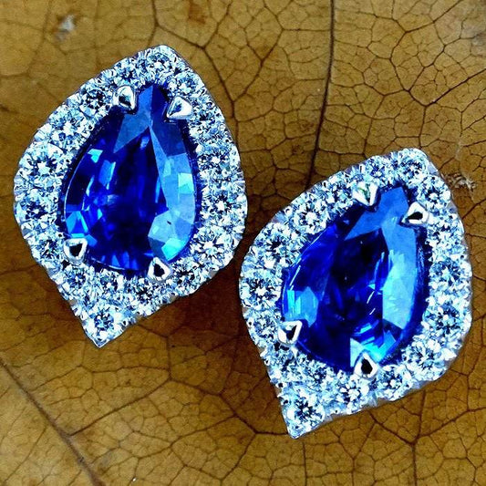 עגילי ספיר ויהלומים במלוא תפארתם, הפנטזיה על עגילי אבני חן ספיר כחול עמוק המוקפים ביהלומים טבעיים