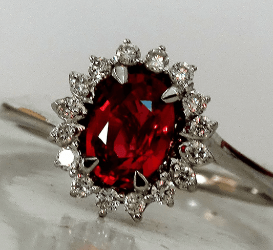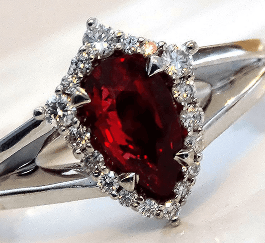 Surrounded by a halo of sparkling diamonds, the exquisite piece is made of 14k or 18k gold, exuding both luxury and durability. Perfect for special occasions or daily wear, this ring is an eternal addition to your ruby jewelry collection.
